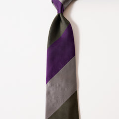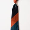 大胆なワイドピッチに、ネイビーをベースにしたオレンジとターコイズのカラーリングが映えるストライプタイ。レップ織の畝幅を部分ごとに変えることで、表情に奥行きを与えています。Vゾーンを一気に華やかにし、スーツスタイルの主役として存在感を放つ一本です。