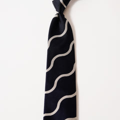 ベーシックなネイビー×ホワイトの配色に、モダンなジオメトリック柄を組み合わせた一本。一見シンプルながらも、角度によって浮かび上がる幾何学模様がVゾーンにさりげない個性を与えてくれます。