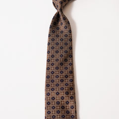 落ち着いたトーンで構成された一本。小紋柄が紋様のように配置され、ヴィンテージ調でありながらモダンな雰囲気も感じられます。ネイビーを基調にカーキとグレーを組み合わせることで、知的で洗練された印象に。ネイビーやグレーのスーツと相性が良く、クラシックな装いをさりげなく格上げしてくれるネクタイです。