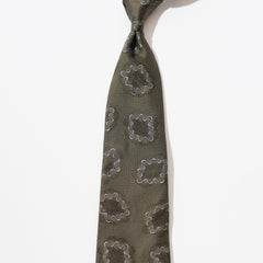 西陣織の膨大なアーカイブ資料から発掘した珠玉のコレクション。ギザギザのジオメトリック柄のデザインはパッと目を引き、モダンでありながらヴィンテージ感のある雰囲気を醸し出すネクタイです。ジオメトリックな柄はカラーリングも強めなものも多いのですが、アースカラーの柔らかいカラーリングなので柄の奇抜さとカラーの柔らかさが程よくマッチして良い塩梅です。こちらのネクタイは大剣小剣ともに裏地を使用せず、生地を手で丸めながら縫製する手三巻(ハンドロール)と呼ばれる特殊な縫製方法で、国内の熟練職人でも1日に数本しか縫う事が出来ない特別な仕様です。生地は旧式のレピア織機でふっくらと織りあげた伝統工芸品の西陣織を採用することで裏地のない手三巻仕様をより引き立てています。日本の職人技を感じる特別な一本をぜひお楽しみください。