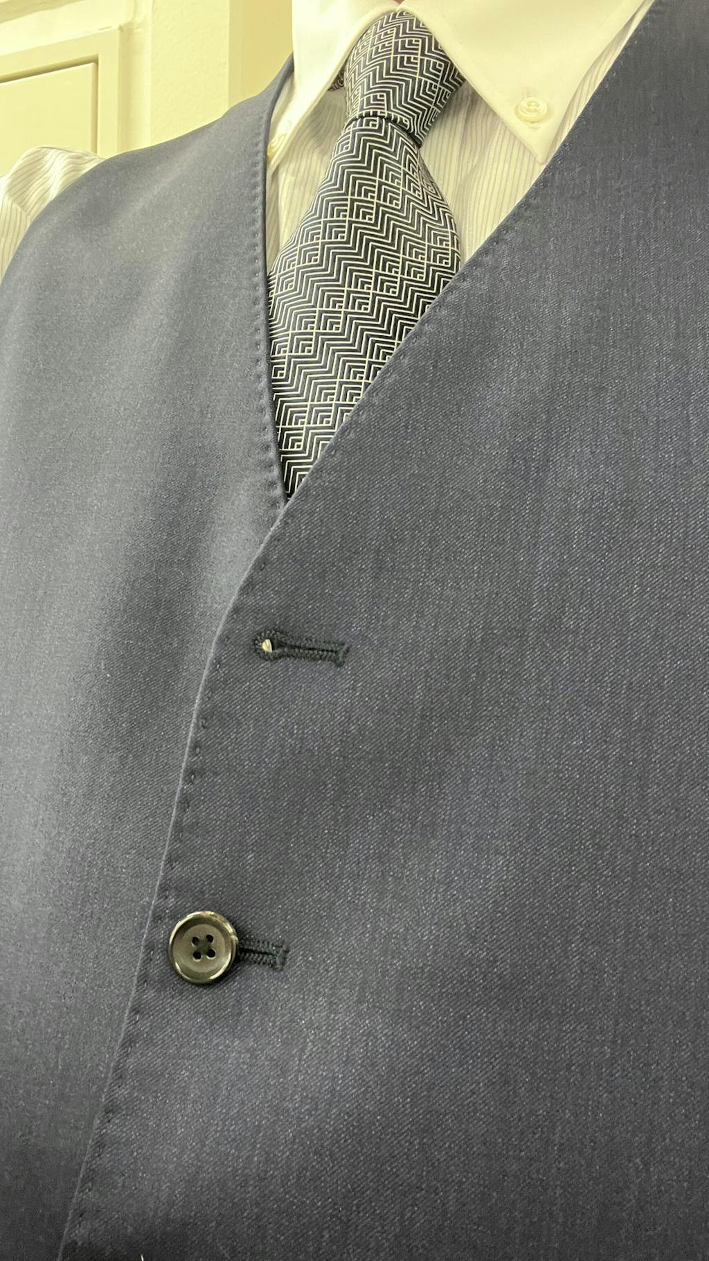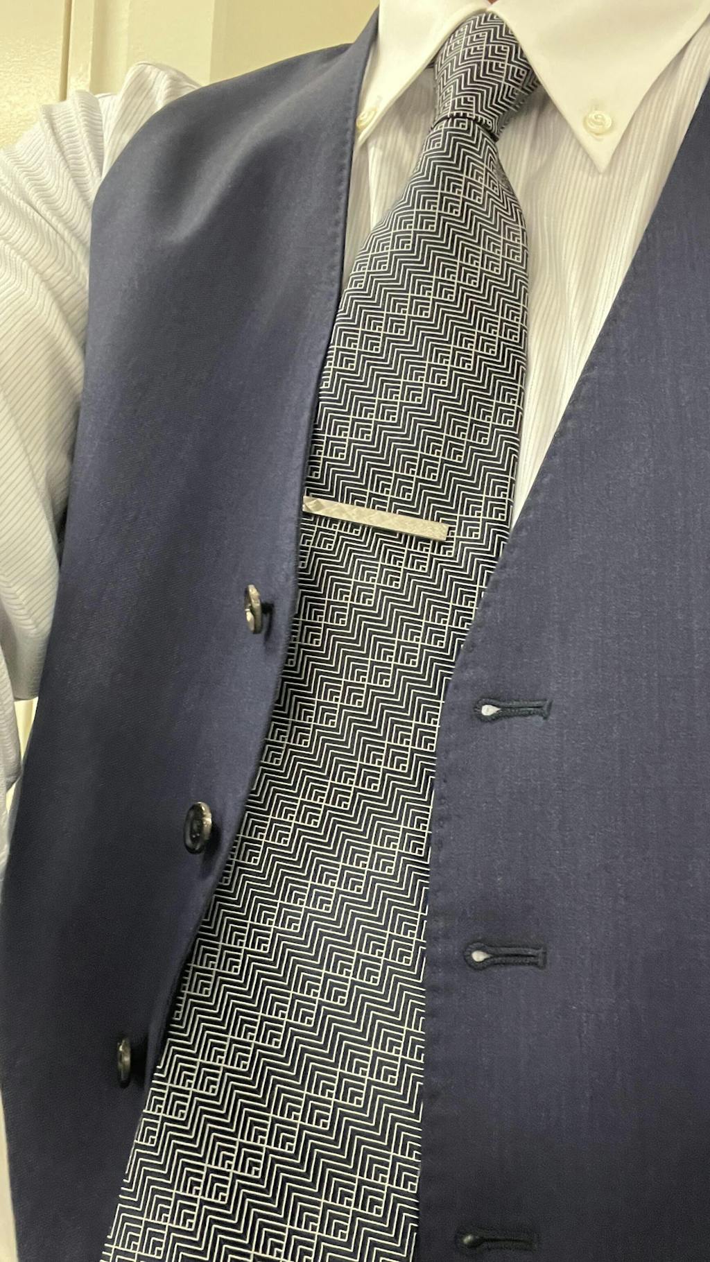 ベーシックなネイビー×ホワイトの配色に、モダンなジオメトリック柄を組み合わせた一本。一見シンプルながらも、角度によって浮かび上がる幾何学模様がVゾーンにさりげない個性を与えてくれます。