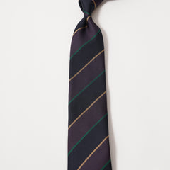 トラッドな雰囲気を胸元に演出してくれるレジメンタルストライプタイ。レジメンタルタイでは定番的なレップ織をあえて採用せず、春夏らしい軽さを感じられるざっくりとしたバスケット織を採用しました。カラーリングは定番のレジメンタルの配色なのでブレザールックの相性はもちろん、シンプルなスーツスタイルのVゾーンにあえて合わせるのも今っぽい雰囲気かと。こちらのネクタイは京都の丹後の旧式のレピア織機で生地を織ることでふっくらとした生地に仕上がり、熟練の職人によって仕立てたハイクオリティなネクタイです。
