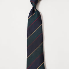 トラッドな雰囲気を胸元に演出してくれるレジメンタルストライプタイ。レジメンタルタイでは定番的なレップ織をあえて採用せず、春夏らしい軽さを感じられるざっくりとしたバスケット織を採用しました。カラーリングは定番のレジメンタルの配色なのでブレザールックの相性はもちろん、シンプルなスーツスタイルのVゾーンにあえて合わせるのも今っぽい雰囲気かと。こちらのネクタイは京都の丹後の旧式のレピア織機で生地を織ることでふっくらとした生地に仕上がり、熟練の職人によって仕立てたハイクオリティなネクタイです。