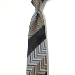 ヘリンボーンの地組織に3段ストライプを組み合わせたベーシックながらも奥行きを感じられるネクタイ。マンネリしたスーツスタイルの胸元に華を添えてくれます。こちらのネクタイはECOPET® (エコペット)という糸を使用しており、不要なペットボトルや衣料品や繊維くずより再生したサスティナブルな糸です。この糸を用いて京都伝統の西陣織で生地を織り上げ、現代のビジネススタイルに合わせて自宅で洗えるウォッシャブル仕様にした伝統と革新性が融合したサスティナブルなネクタイです。