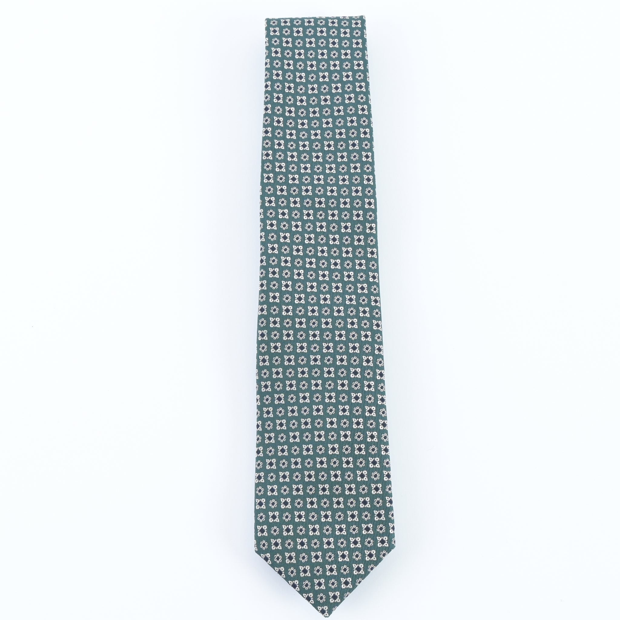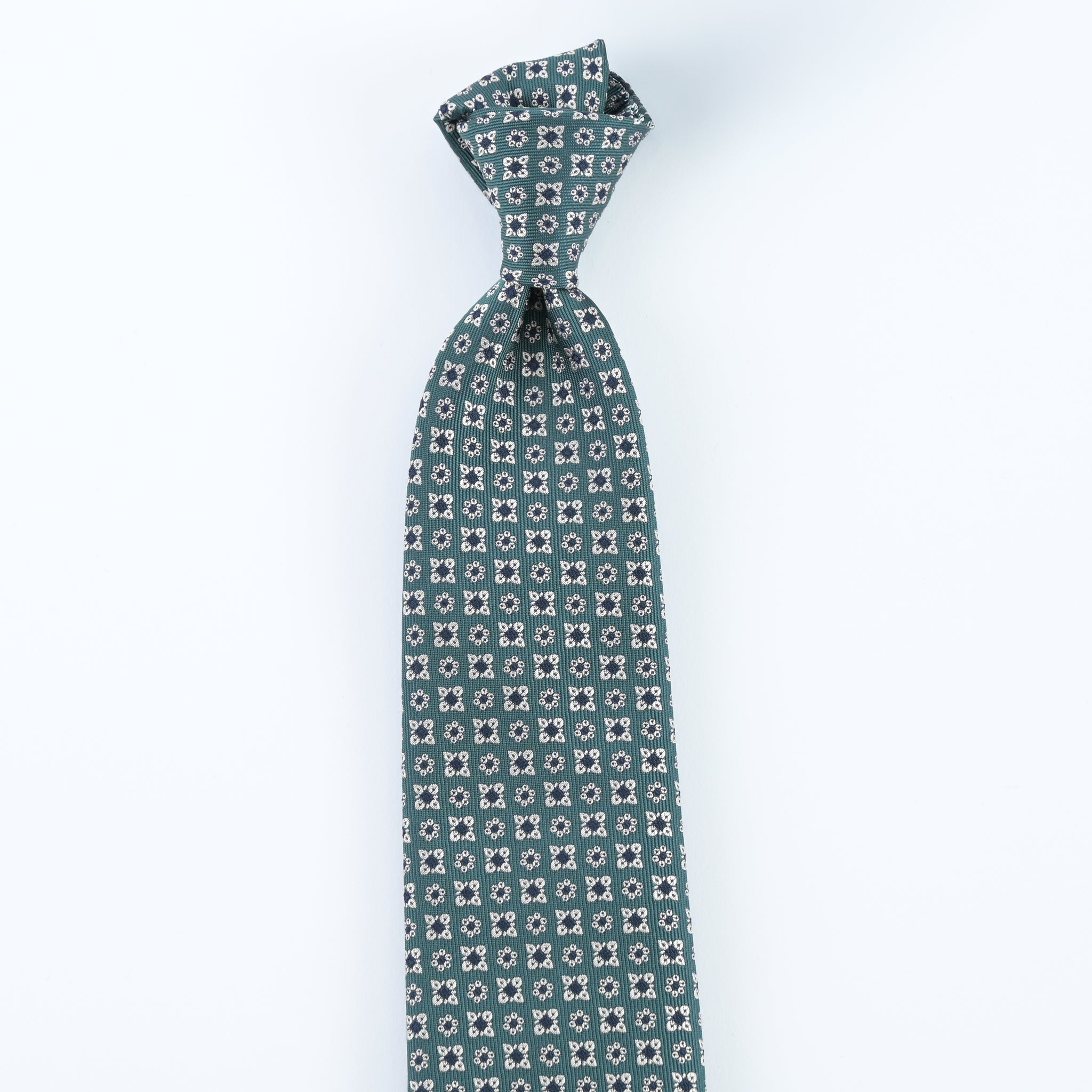 深みのあるペトロールカラーをベースに、小紋モチーフを端正に配した一本です。