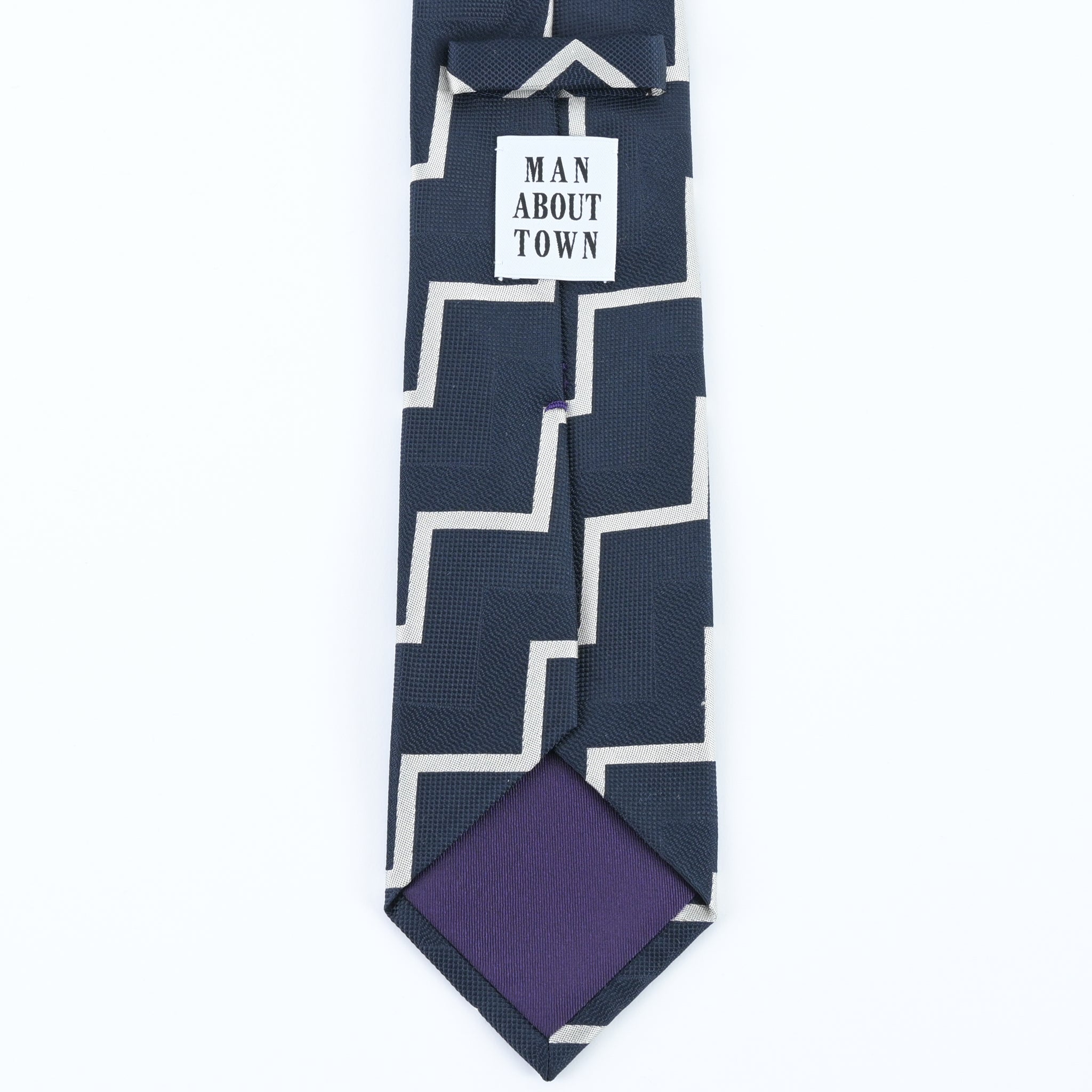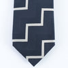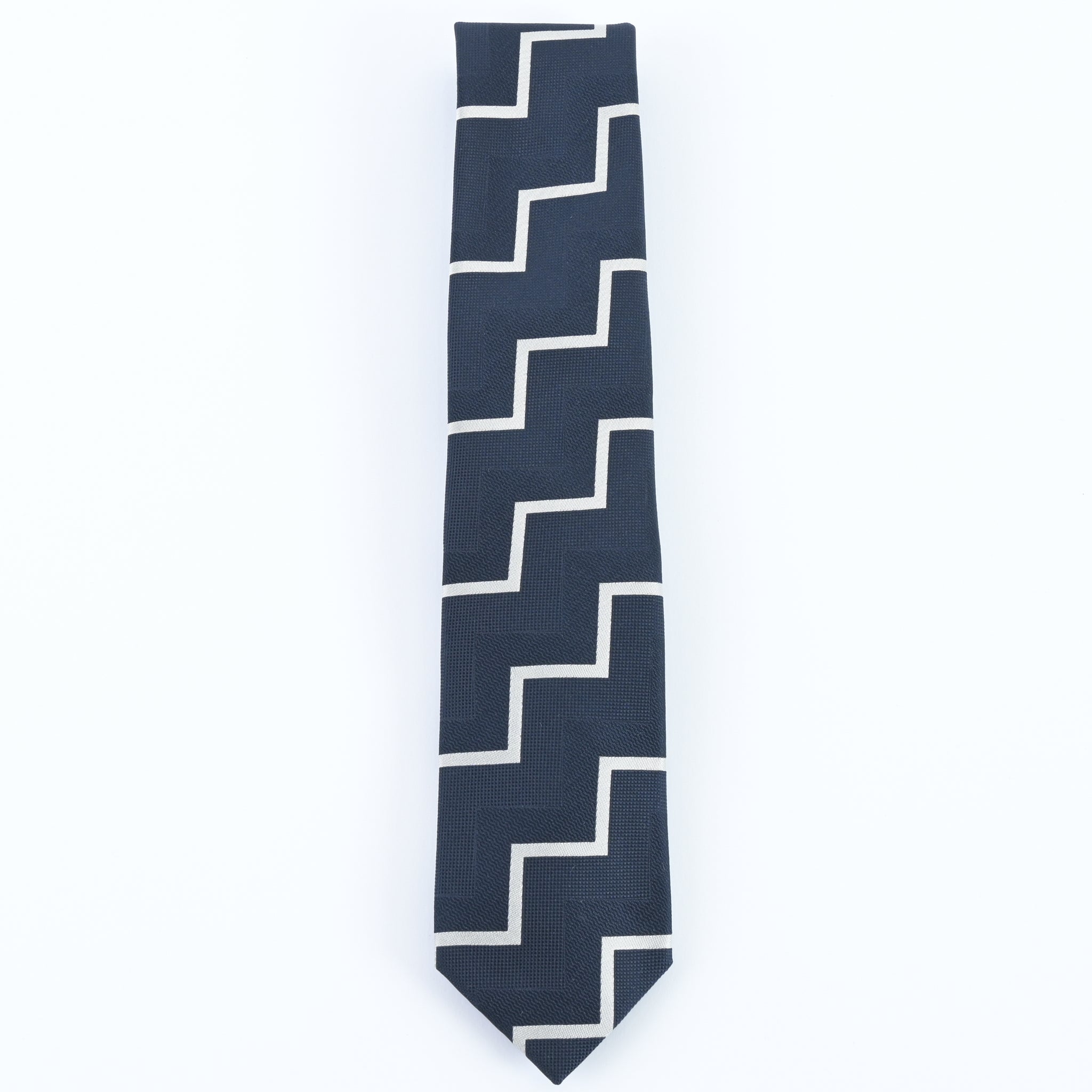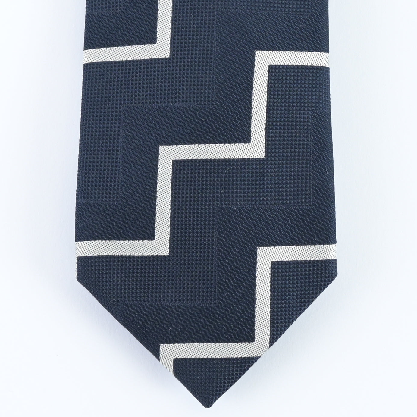 深みのあるネイビーベースに、ホワイトのシェブロンストライプを大胆に配した一本です。