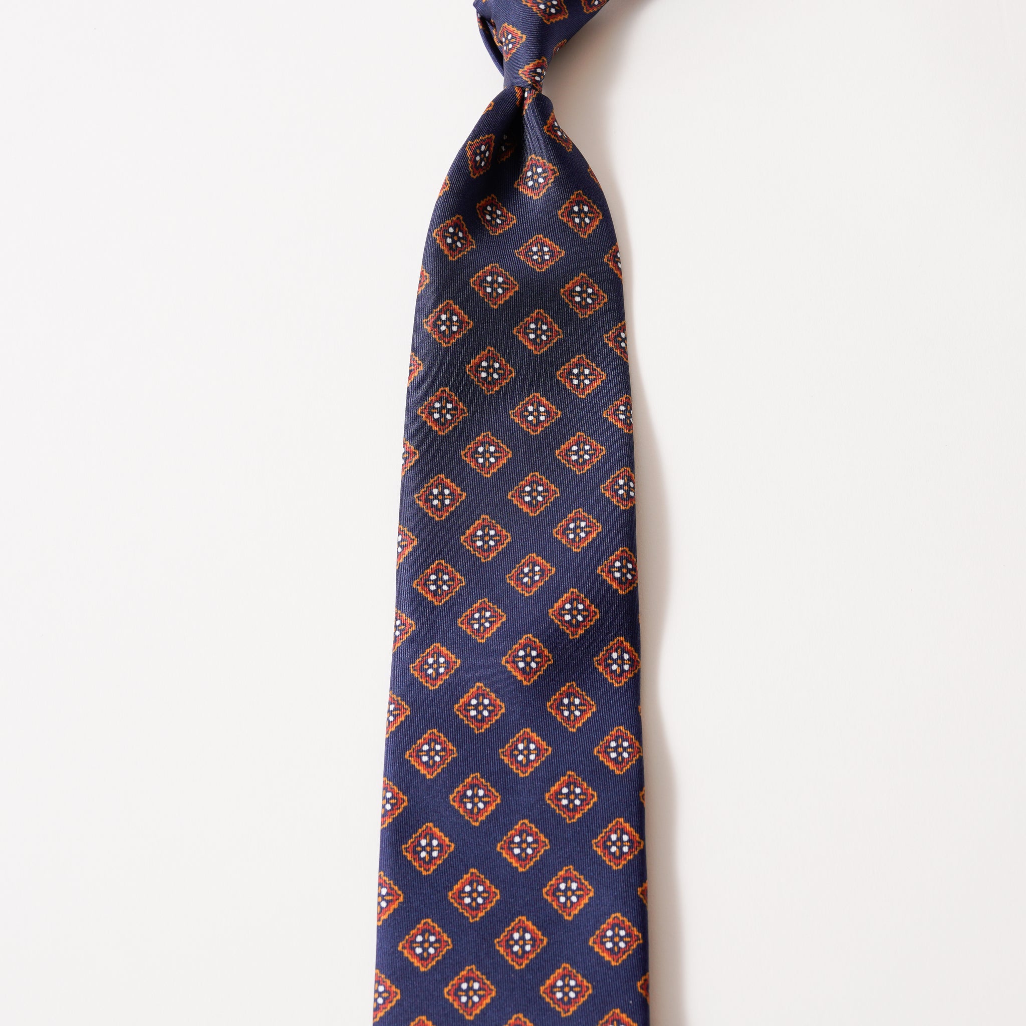 クラシックな小紋柄ながら、テラコッタやオレンジを効かせた配色が今のムードを感じさせる一本。ベーシックなスーツスタイルの胸元を華やかに引き立て、ほどよく洒落感をプラスしてくれます。ビジネスシーンからカジュアルなジャケットスタイルまで幅広く活躍します。