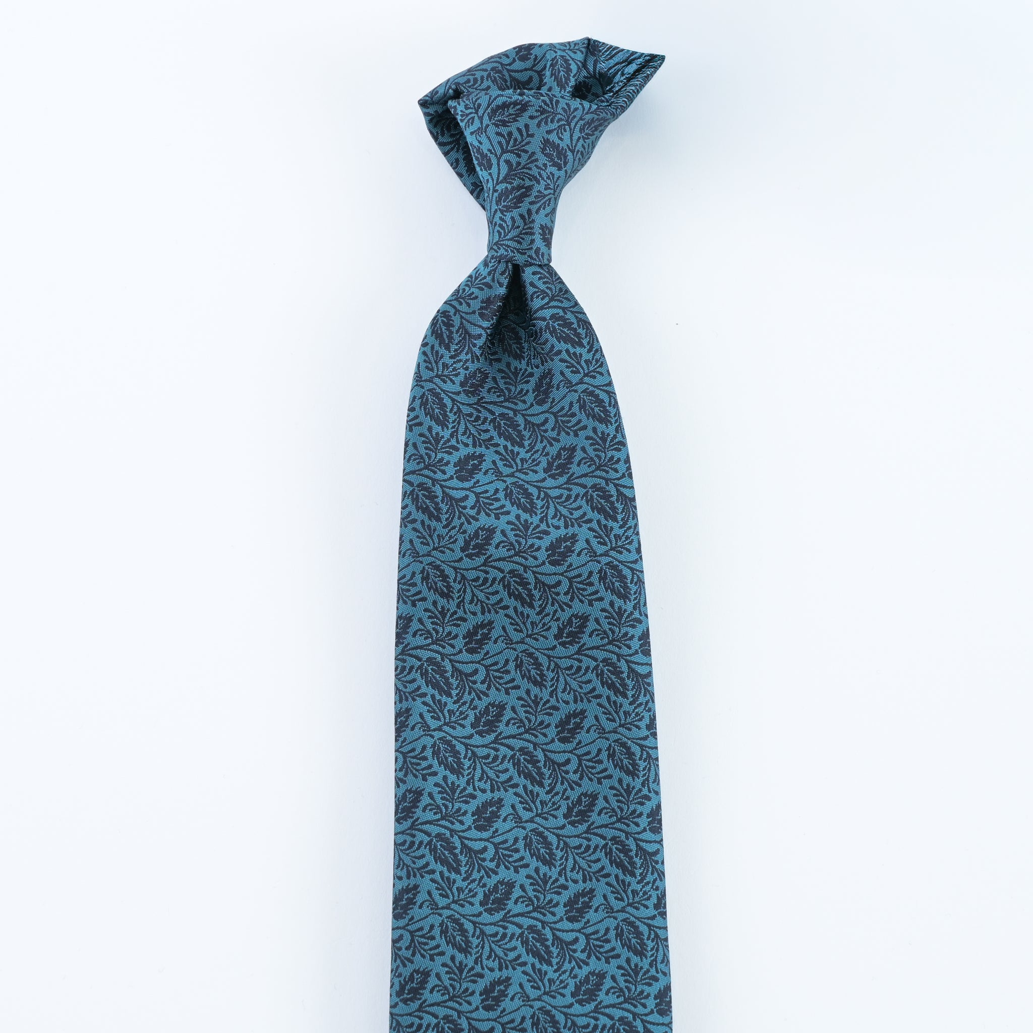 鮮やかさを抑えたターコイズベースに、ネイビーのボタニカル柄を重ねた一本です。